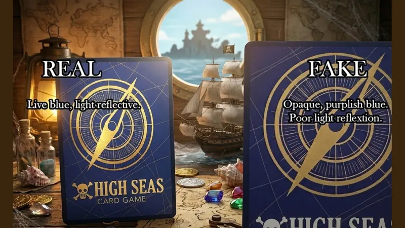 C'est souvent le test le plus rapide et le plus fiable pour reperer une contrefacon. Le dos de toutes les cartes One Piece Card Game (sauf les Leaders, qui ont un dos rouge) utilise une palette de couleurs tres specifique que les faussaires echouent systematiquement a reproduire.